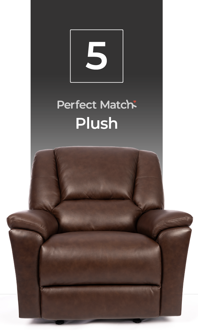 The Plush is the largest model, featuring a 45-inch seat with an extra inch of depth and is available in leather. It includes a power headrest and power lumbar, providing the ultimate in comfort.