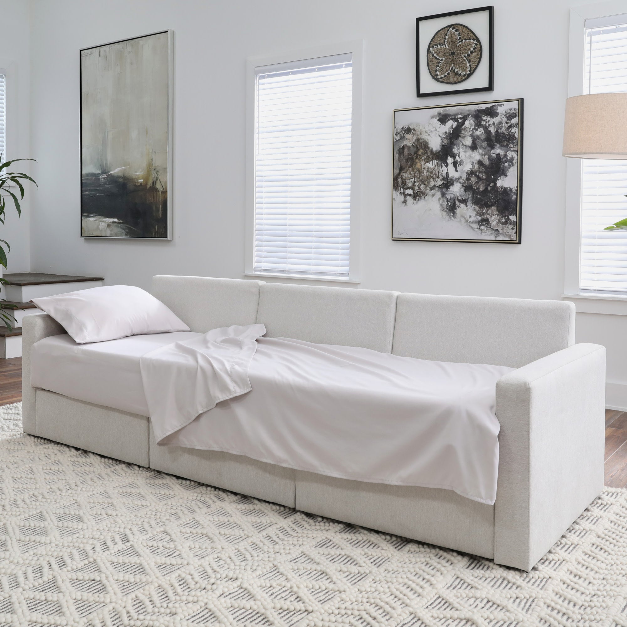 Evolve your Flex modular seating system into a bed with the Flex sleep kit. Complete with a memory foam topper, fitted sheet, top sheet and pillowcase, this kit is designed to fit over any three Flex seats, protecting your furniture while accommodating extra guests at night. Easily store the sleep kit in a Flex storage ottoman or under the spring unit of any Flex seat.
